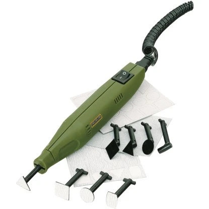 Der Penschleifer PS 13 von Proxxon ist ein superfeines Schleifgerät mit linear-schleifender Fläche (nicht rotierend) mit einem langlebigen DC-Spezialmotor. Daher eignet er sich ideal für das Bearbeiten von Oberflächen in Aussparungen, Schlitzen, Fächern, kleinen Ecken. Das Gehäuse des PS 13 besteht aus glasfaserverstärktem Polyamid. Zum Gerät gehören je vier gerade und abgewinkelte Schleifeinsätze mit unterschiedlich geformten Flächen. Dazu drei Bögen selbstklebendes Schleifpapier Korn 180, 240 und 400. Auf jedem Bogen sind 5 x 4 verschiedene Formen vorgestanzt.
